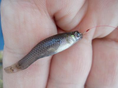 Well since it was a nice day I decided to go out to the pond and do a little fishing. Well the bream were not biting nor were the catfish but in the shallows I saw these guys all over. Anyway I broke out my smallest pole (elcheapo from E-Bay see photo), put on a snelled tanago hook. and got my photo tank ready (btw it came from here as did the hooks). Anyway I cut a tiny bit of worm using my surgical scissors and proceeded to use tweezers to thread it on the hook.