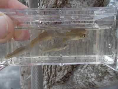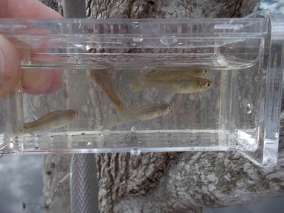 So once baited up I simply dropped the bait tight lining it (using a no4 splitshot as weight) and these guys were all over it. I actually hooked 9 of them but only took a picture of 1 on my hand and the 5 in the tank (which got transferred to my aquarium inside for a while). Of course I had many drop off as they just had the worm and not the hook.