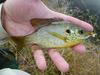 Having spooked another pond, I moved on. The next one had fish rising, but none for me. At the last and largest pond, I fish around it for a bit for no strikes, then both suddenly and surprisingly, a black crappie smashed my popper. I knew there were crappie in the creek because I'd found one once before using a worm, but this guy was hangin’ out with friends and I spent the next hour or so in a ten yard section of the pond throwing them poppers and killer bugs and the like. All in all I landed 10, with four redear gills thrown in for good measure.